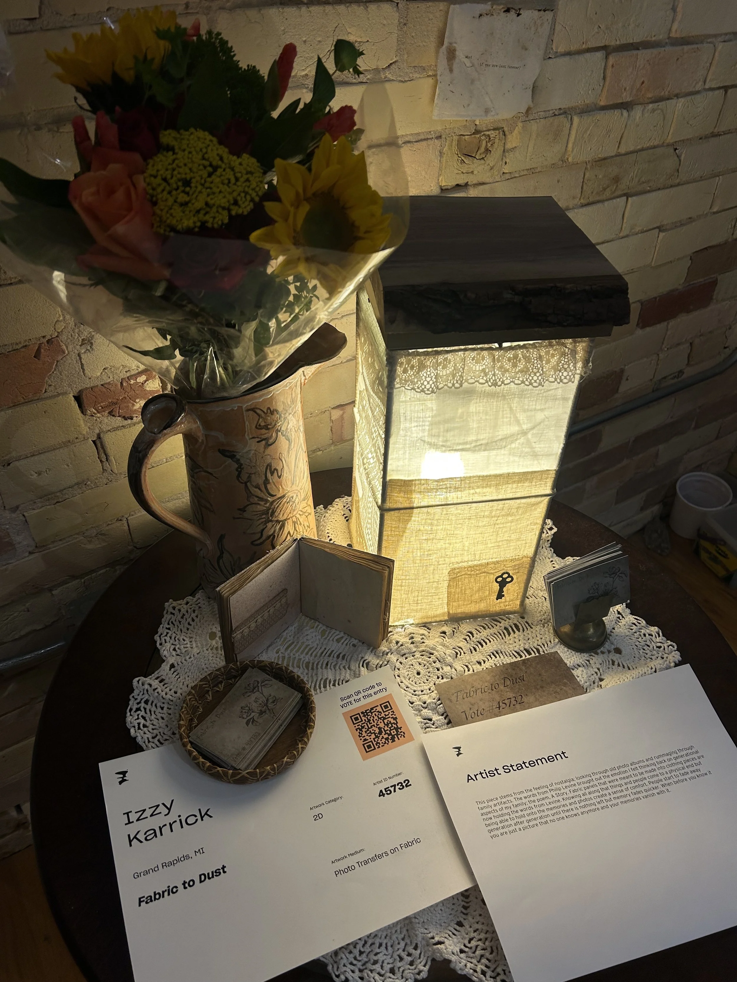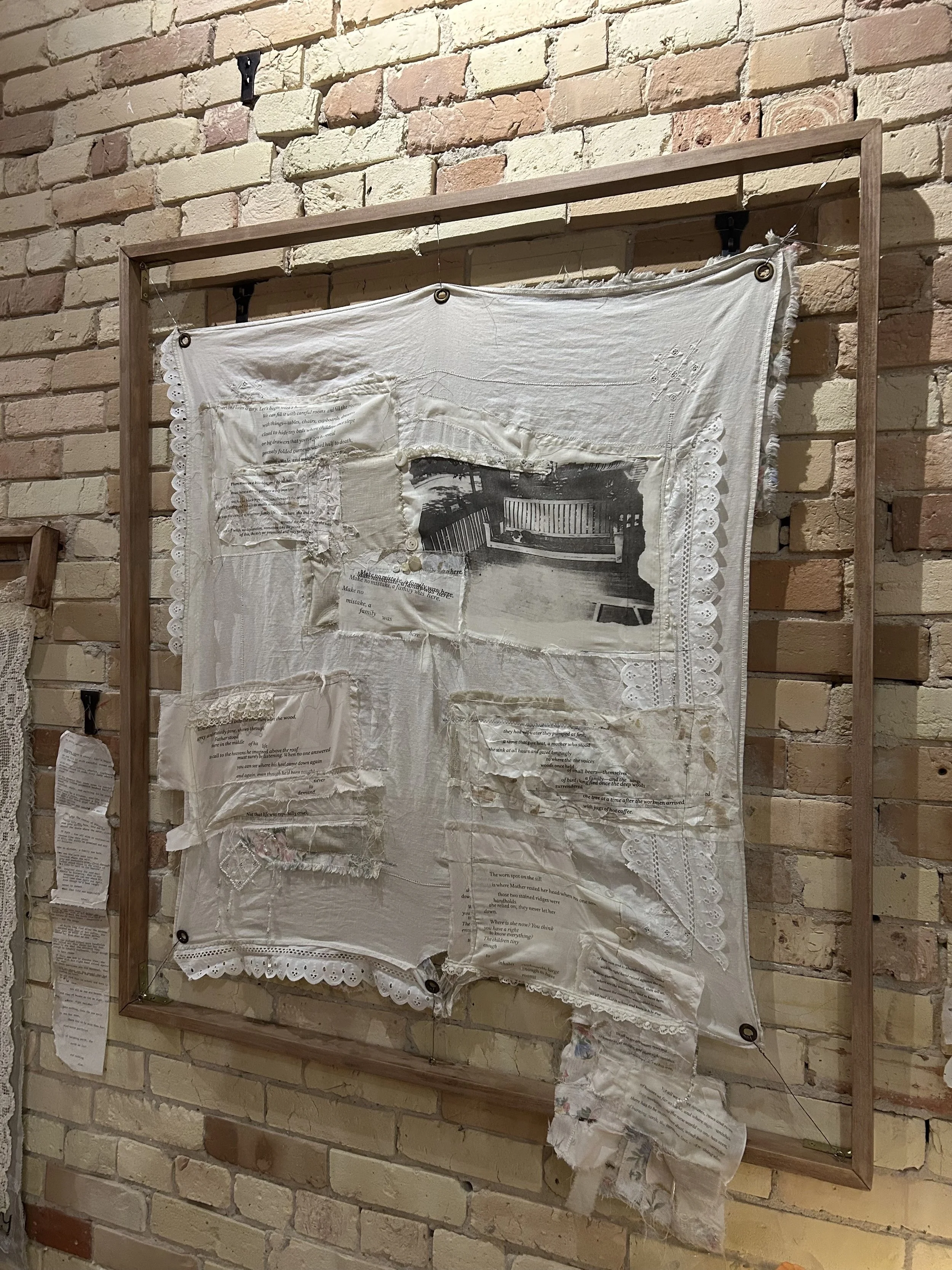 This piece stems from the feeling of nostalgia; looking through old photo albums and rummaging through family artifacts. The words from Philip Levine brought out the emotion I felt thinking back on generational aspects of my family; the poem, A Story. Fabric panels that were meant to be made into clothing pieces are now holding the words from Levine. Knowing all along that things and people come to a physical end but being able to hold onto the memories and photos create a sense of comfort. People start to fade away generation after generation until there is nothing left but memory fades quicker. When before you know it you are just a picture that no one knows anymore and your memories vanish with it.